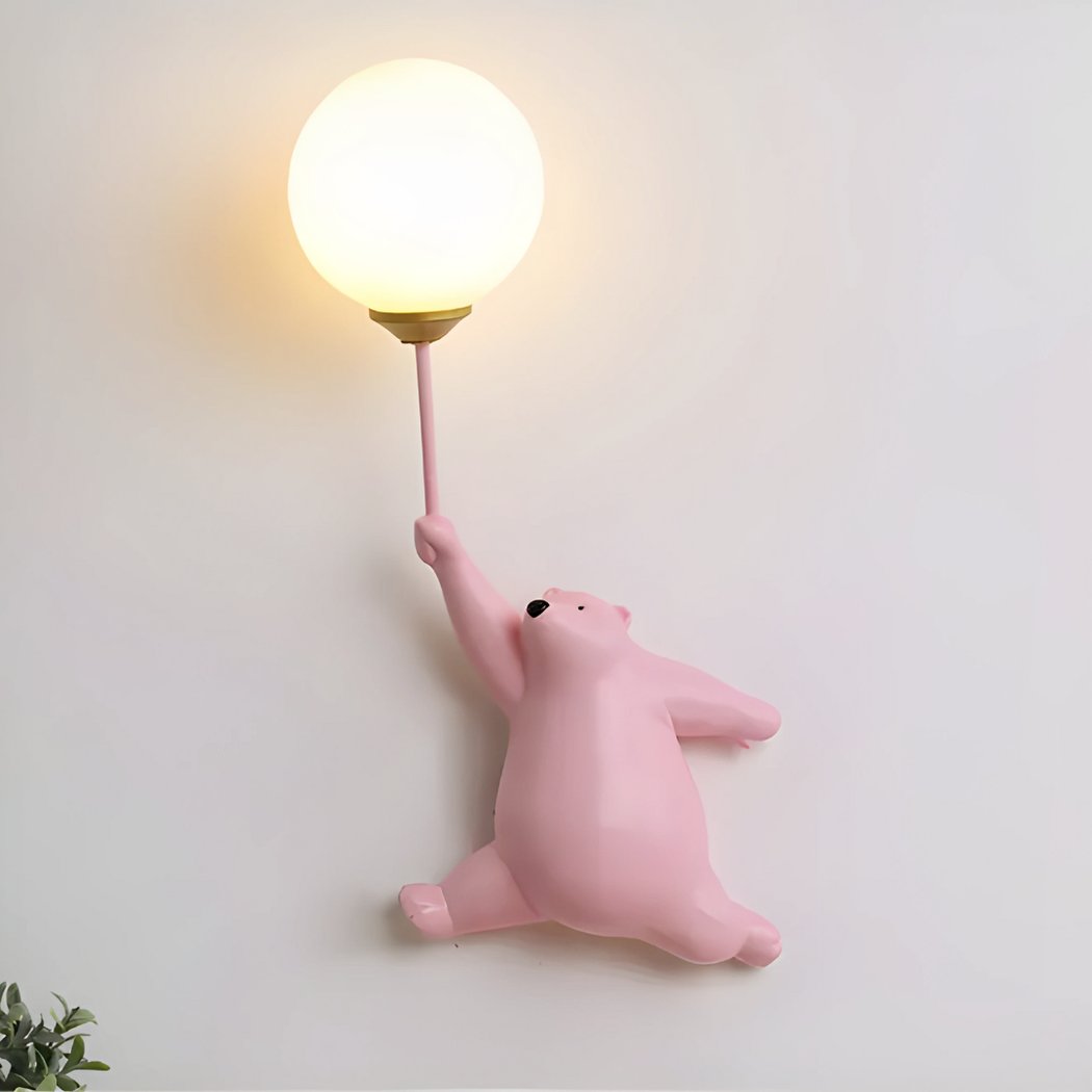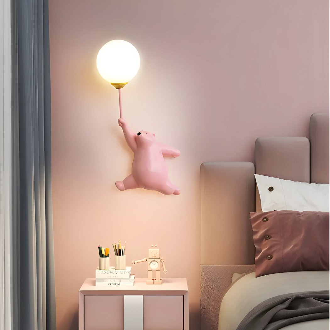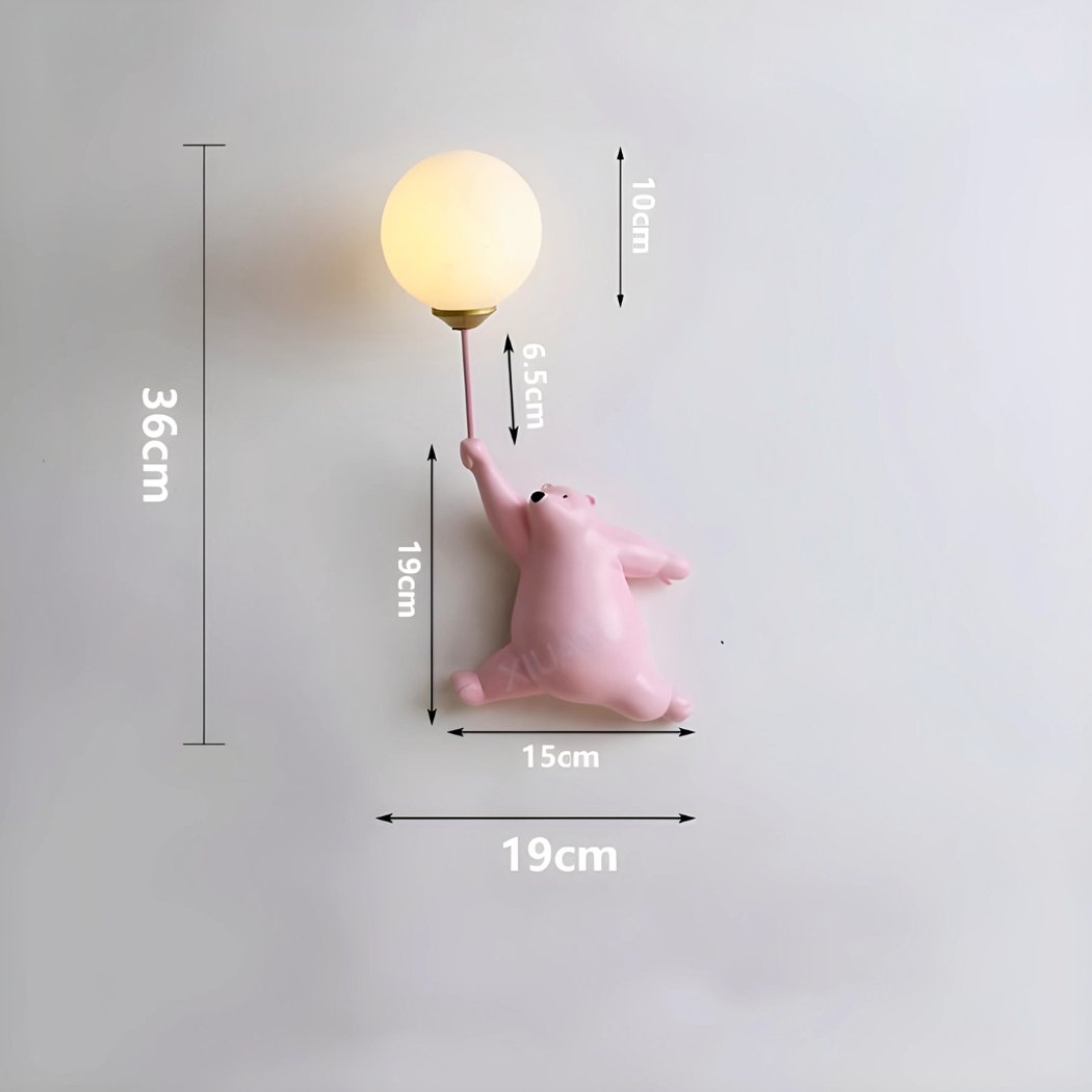 La lampe murale est magnifiquement conçue avec un ourson tenant entre ses pattes une boule lumineuse en forme de ballon bleu ou rose. La boule évoque l'image d'un ballon qui s'élève dans les airs, créant ainsi une atmosphère de légèreté et de joie.