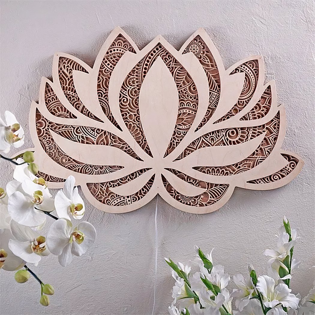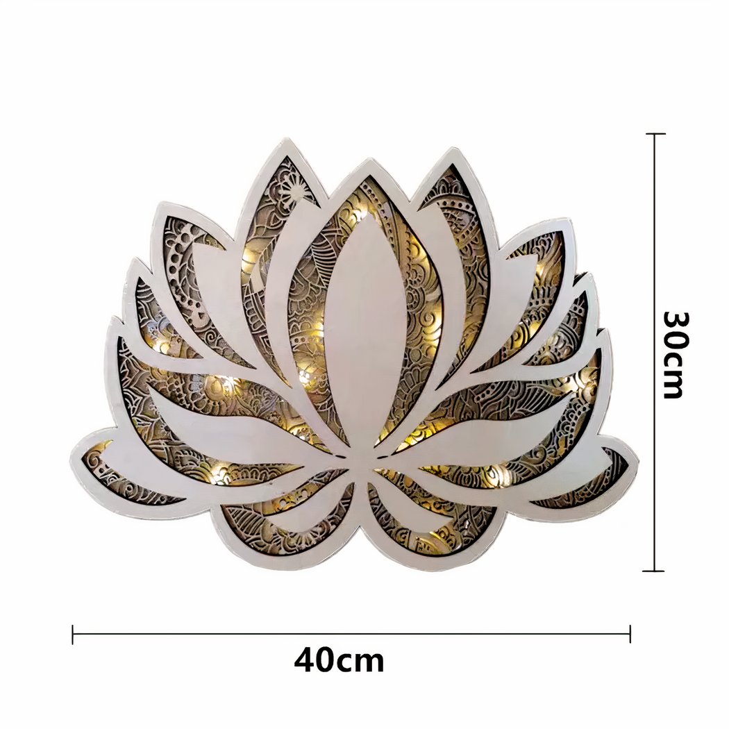 Lorsque la lumière est allumée, la fleur de lotus mandala révèle toute sa splendeur en laissant passer la lumière douce à travers ses motifs ajourés. Son design en bois naturel lui confère une atmosphère chaleureuse et authentique.