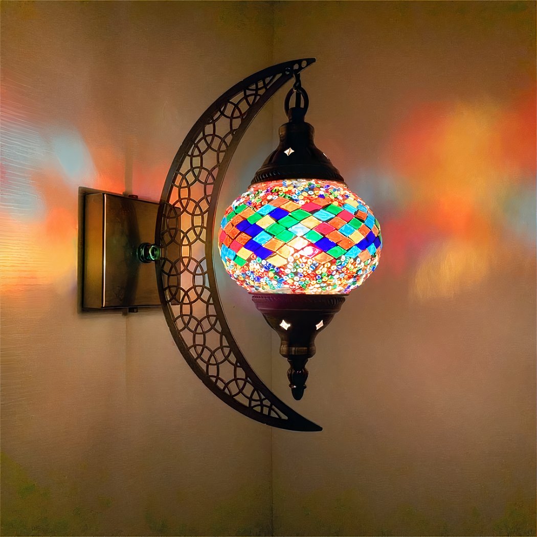 Révélez la splendeur de votre intérieur avec notre applique murale demi-lune, une véritable œuvre d'art qui célèbre l'artisanat traditionnel oriental. Son abat-jour en verre, habilement rempli de mosaïques multicolores aux motifs enivrants, diffuse une lumière douce et apaisante, créant ainsi une atmosphère empreinte de magie et de sérénité.
