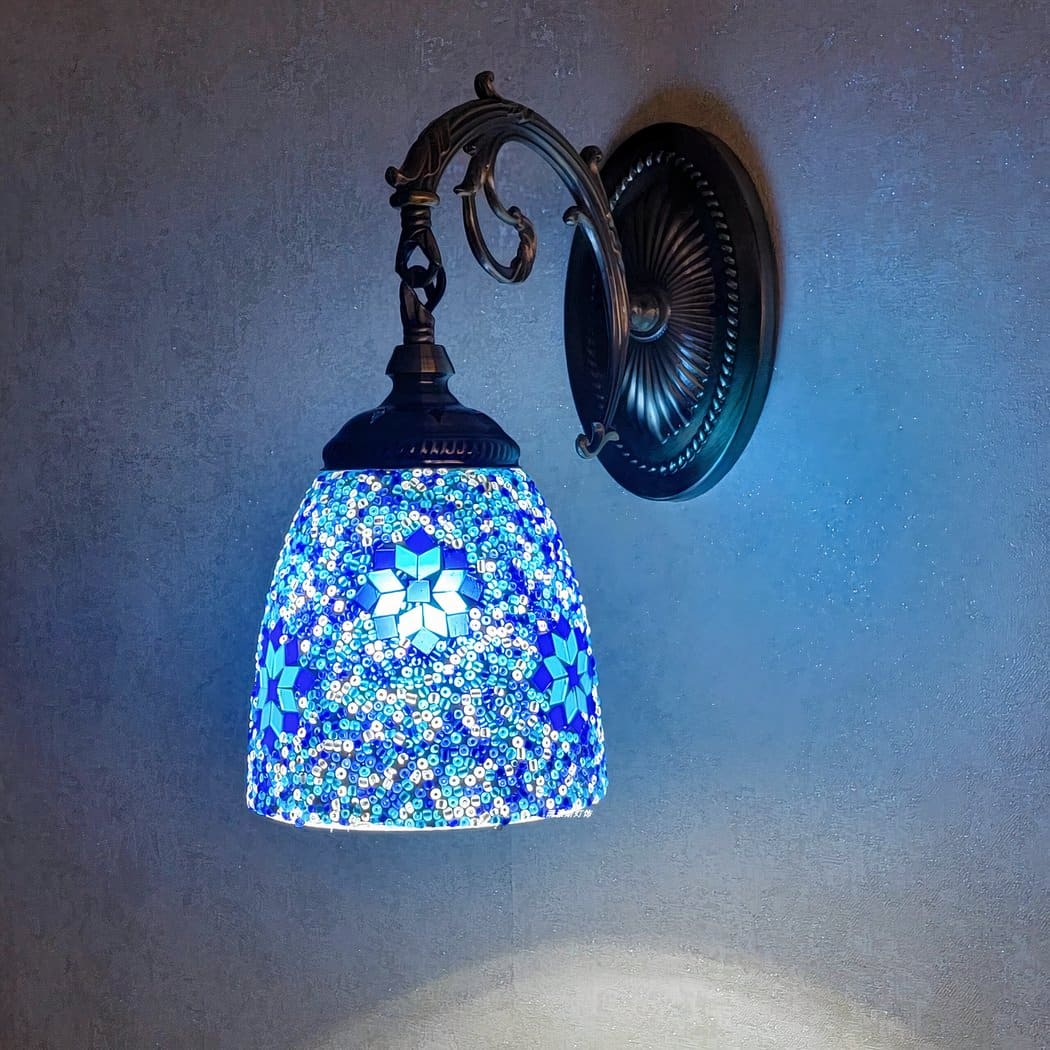 Plongez dans une ambiance envoûtante avec notre applique murale aux détails minutieusement travaillés. Sa mosaïque éclatante et ses dessins uniques diffusent des tons aux reflets bleus subtils et vibrants, illuminant chaque recoin de votre intérieur avec élégance.