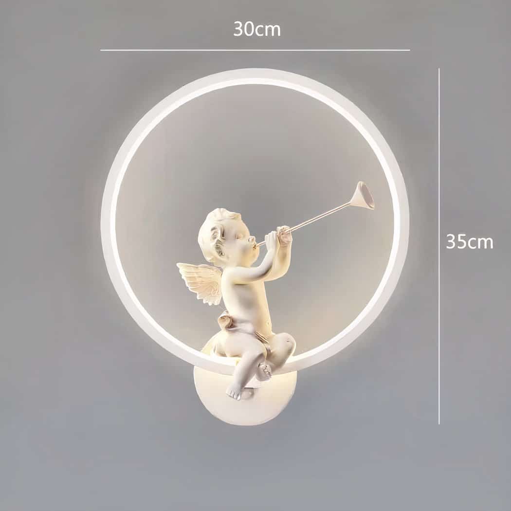 Cette applique murale en forme de cercle blanc, avec un ange assis délicatement dessus, jouant un instrument de musique s'élève bien au-delà de sa simple utilité lumineuse pour incarner une symbolique profonde de réconfort.