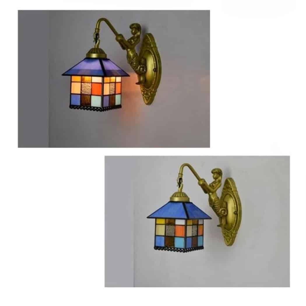 Fabriquée avec des matériaux de haute qualité, cette applique murale est ornée de magnifiques vitraux aux tons bleutés qui créent un effet lumineux et chaleureux une fois allumée. Sa base en fer forgé représente une sirène qui pêche amenant subtilement un côté marin à votre décoration.