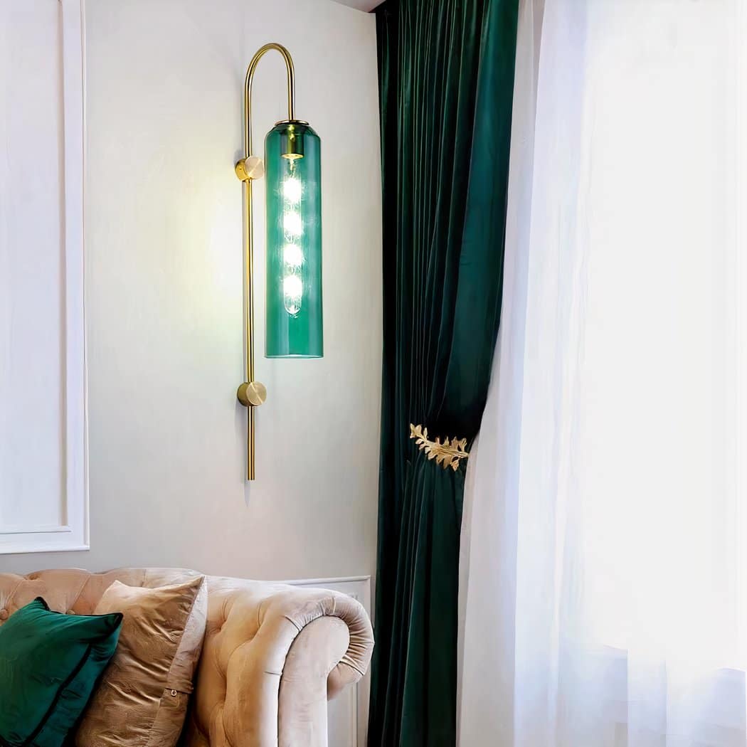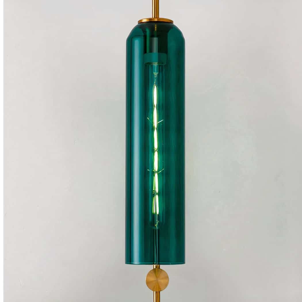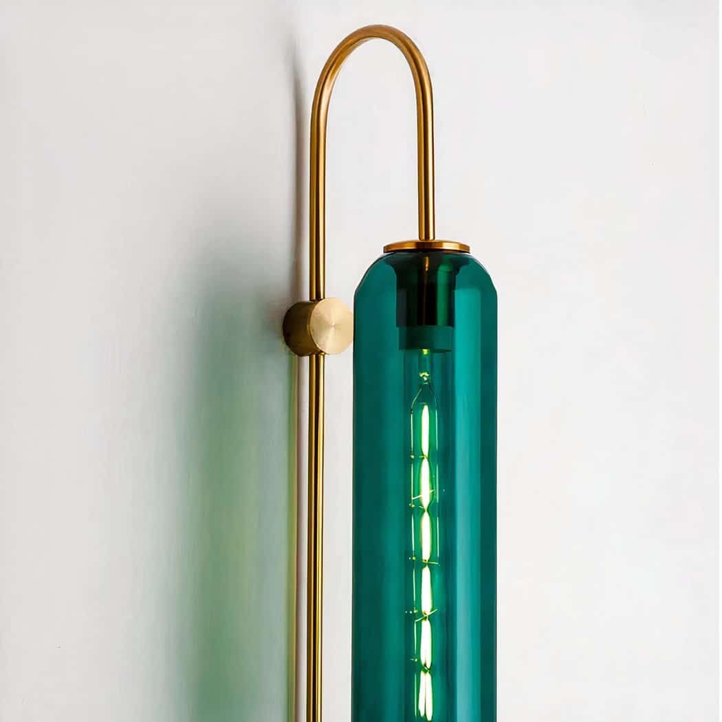 Plongez dans l’élégance intemporelle de notre applique murale tube en verre style art déco. Son design inspiré du mouvement art déco, avec son tube en verre coloré bleu canard et son support en cuivre doré, crée une ambiance sophistiquée dans votre espace, alliant style rétro et modernité.